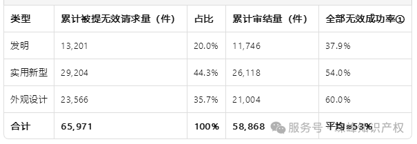 截至2025-11-13,官方已公开的65,971件无效案件中,实用新型占比最高(44.3%),外观设计全部无效成功率最高(60%);发明无效比例最低37.9%!